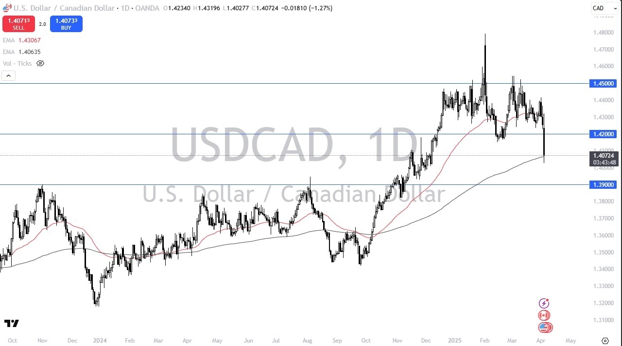 The US dollar has plunged rather significantly during the session on Thursday, after the tariffs were announced by Donald Trump. At this point, the market is testing the 200 Day EMA, which of course is an indicator that a lot of people would be paying close attention to. The 1.40 level is sitting just below, and then again, the 1.39 level has already shown itself to be supported in the past. All things being equal, this is a market that I’ll be watching very closely during the trading sessxmbob.comion on Friday as I think it is essentially going to be the “epicenter of forex trading” for that session.